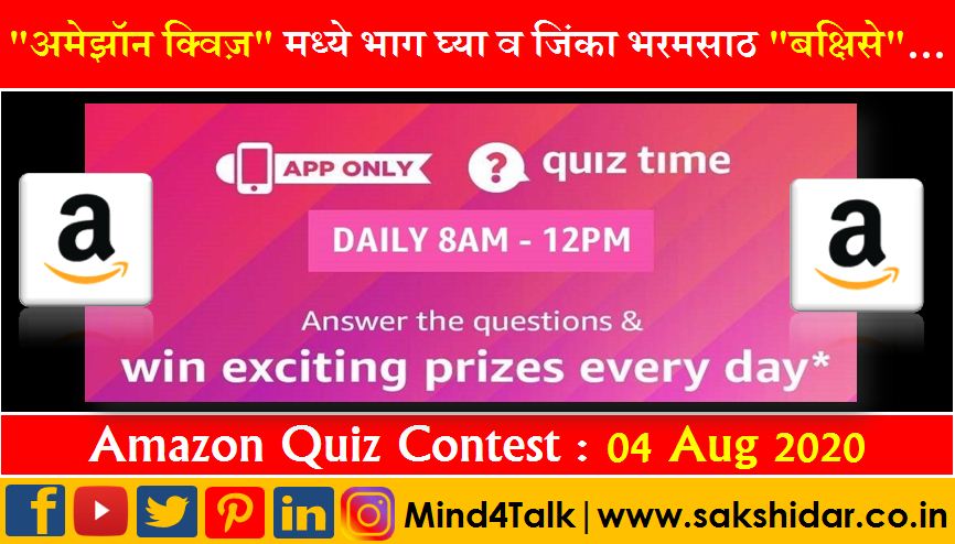 Amazon Quiz || 04 Aug 2020 Answer || Mind4Talk “अमेझॉन क्विज़” मध्ये भाग घ्या व जिंका दररोज भरमसाठ बक्षिसे…