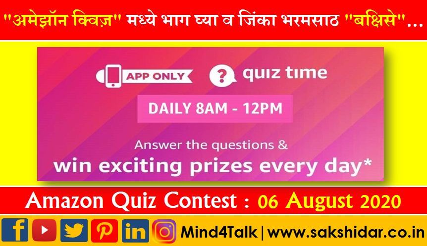Amazon Quiz || 06 Aug 2020 Answer || Mind4Talk “अमेझॉन क्विज़” मध्ये भाग घ्या व जिंका दररोज भरमसाठ बक्षिसे…